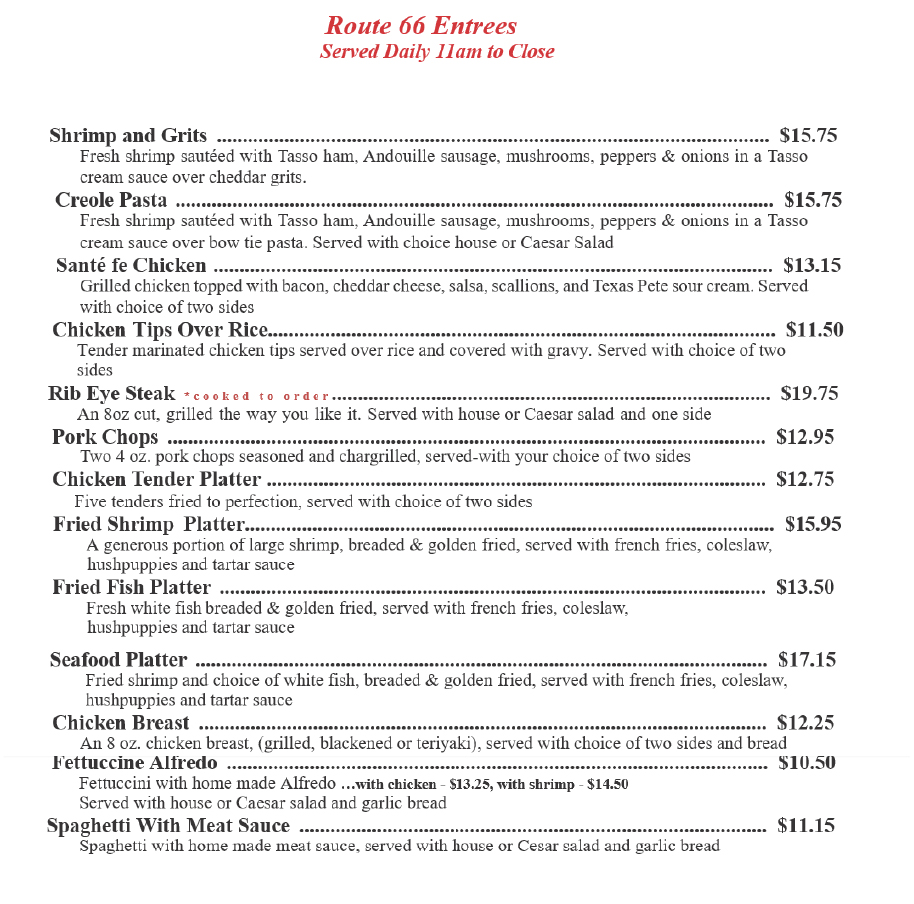 The amazing staff of Kernersville’s Route 66 hosted our son’s rehearsal dinner tonight. Words cannot express how thankful I am and what an amazing job they did! The ribeye steak was so terrific. Tender juicy and very very yummy. They went all out for our party of 50 and I know it was a lot of work for them but they were so nice and everyone had a fantastic evening. I definitely recommend this restaurant! Their normal menu has so many options but I appreciate how they worked with us for this special occasion!